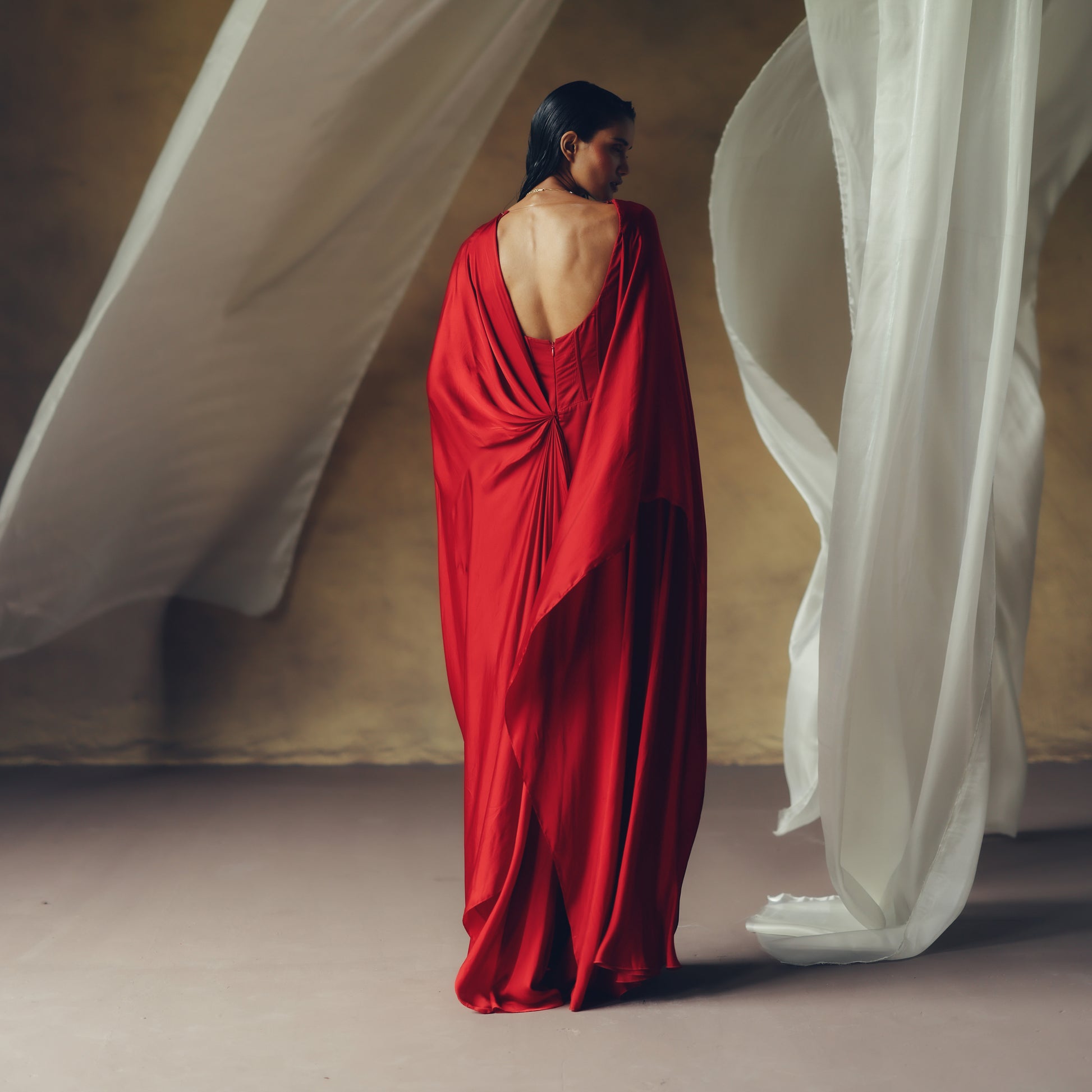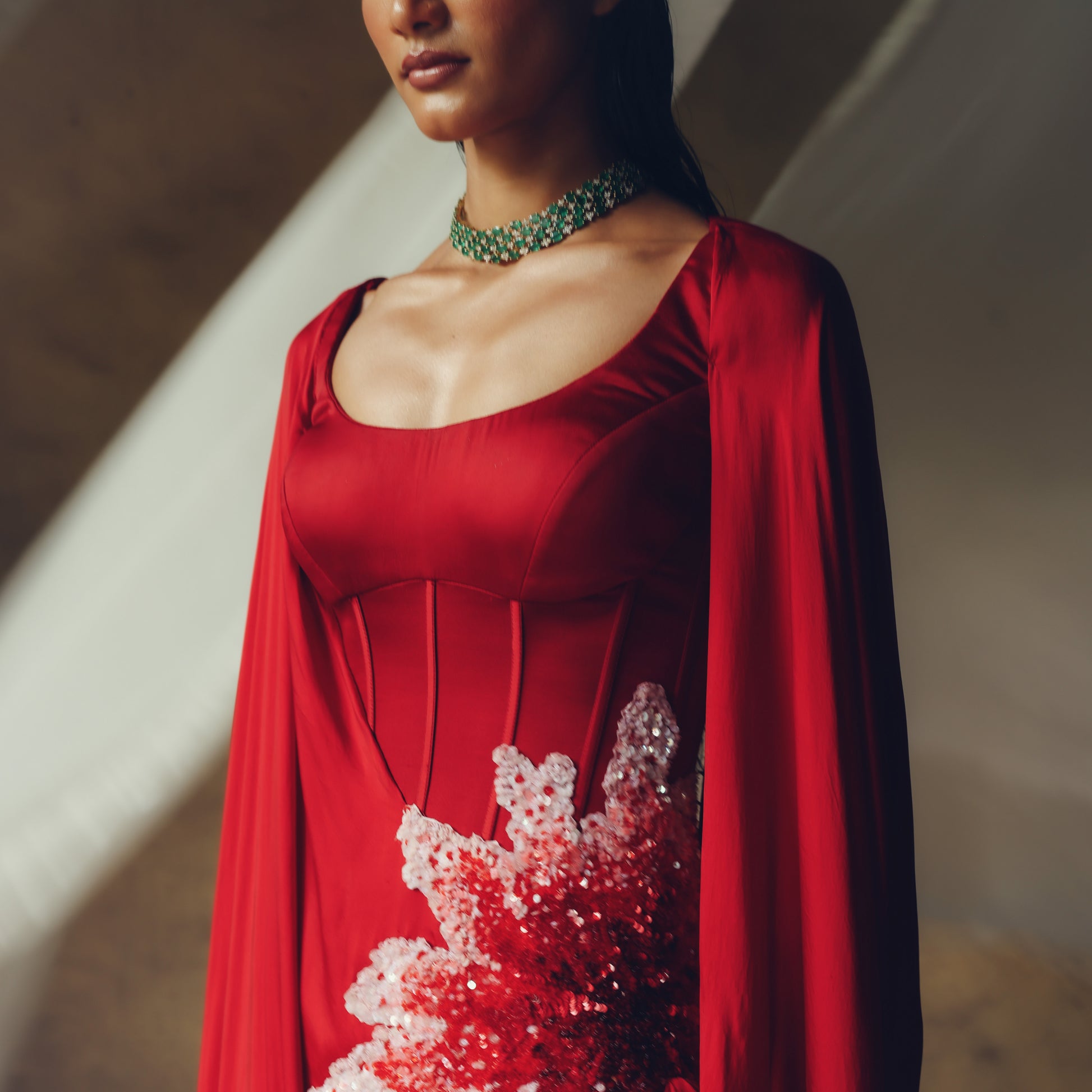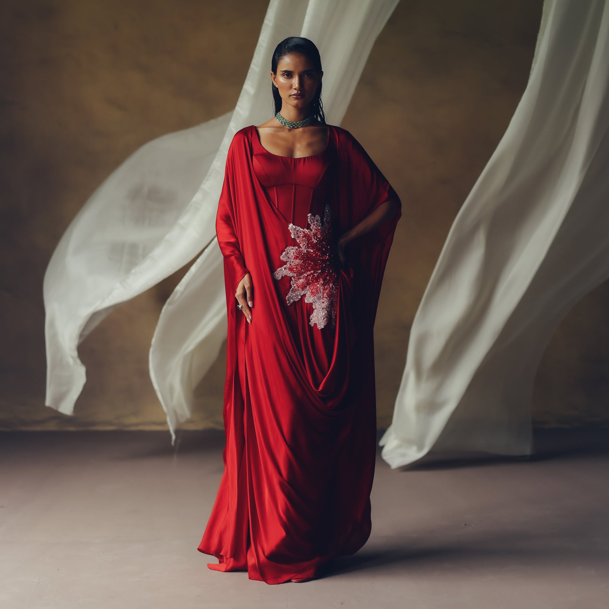 The drapes softly unfold from the meticulously detailed floral embroidery, creating the illusion of a blooming rosette with precisely placed colour accents across the surface. A detachable drape lends versatility- striking the perfect balance between formality and ease.