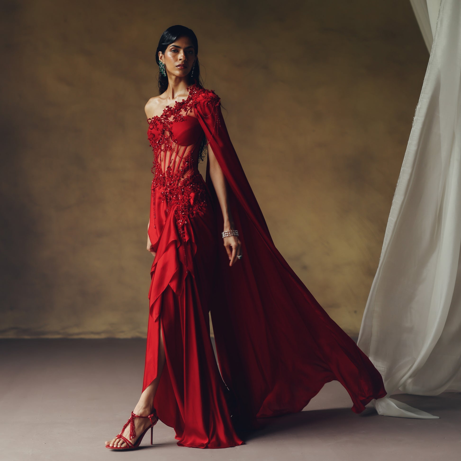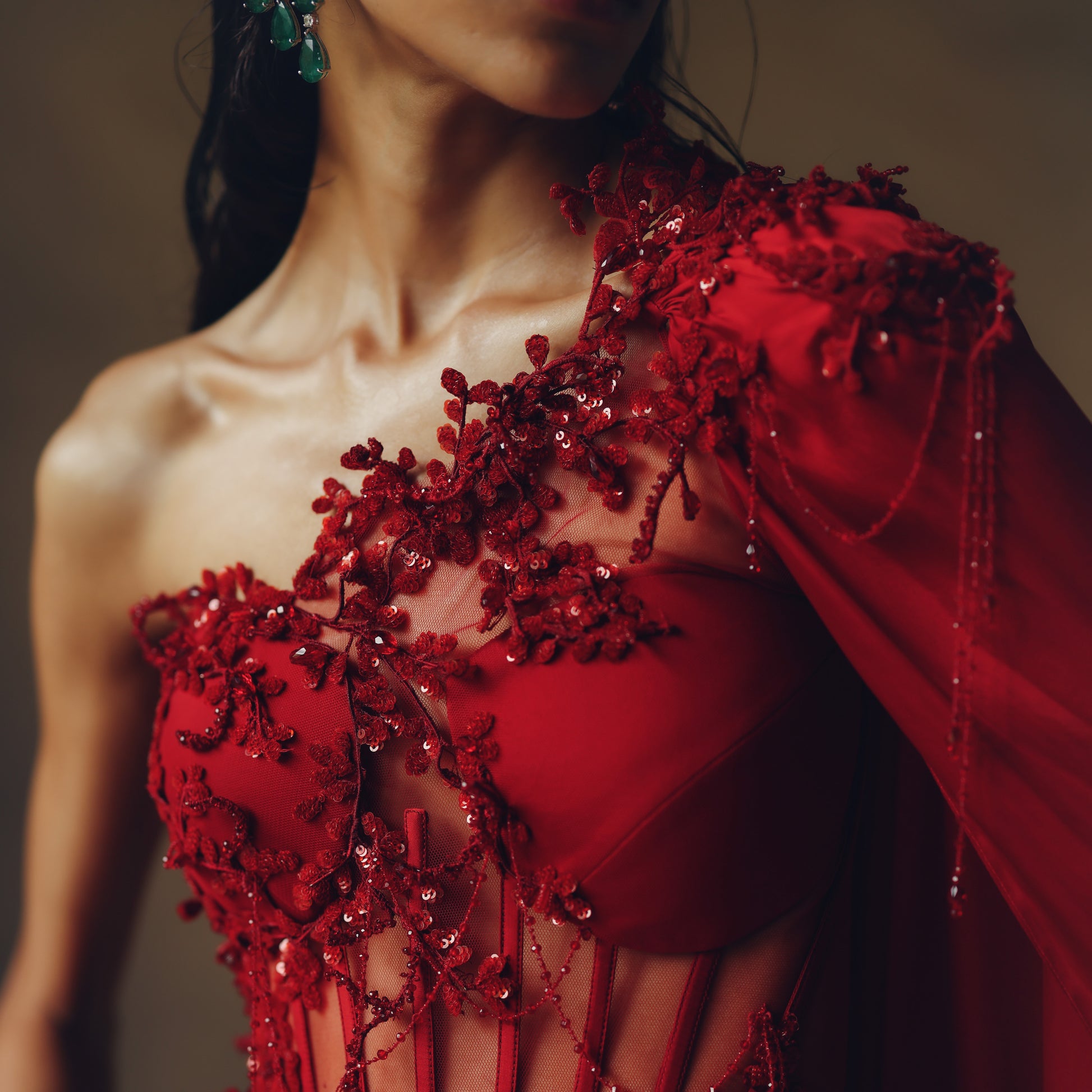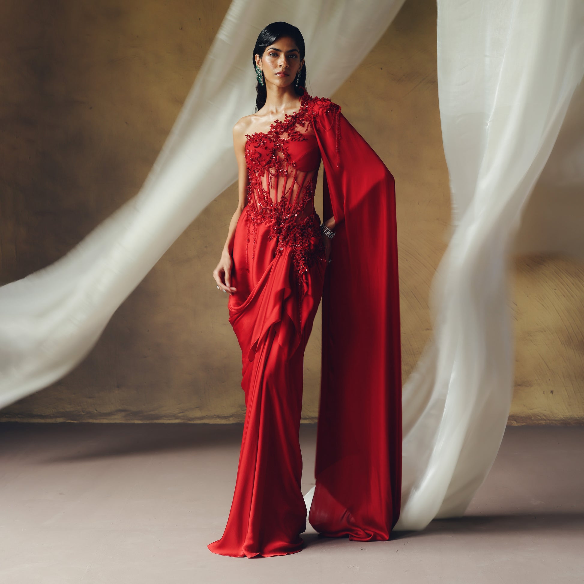 Crafted in our iconic Aggunj Oxblood red, the gown features mandorla embroidery with drapes playfully interwoven into the surface, creating a sculptural flow of movement and light. Whether you wear your hair up or down, this statement ensemble ensures your presence is nothing short of remarkable.
